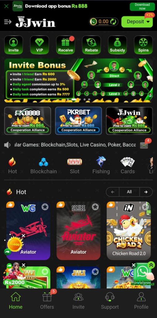 JJwin Apk shines with its generous bonuses that keep players hooked and boost their chances of winning big. Right off the bat, new users get a welcome bonus—often Rs888 just for signing up or up to 20% on your first deposit, giving you extra credits to explore games like slots or live casino without dipping too deep into your pocket.