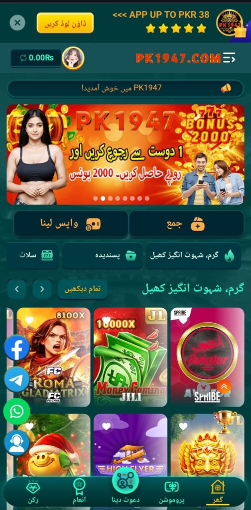 Pak1947 game is a android supported mobile game which provides alot of mini games like fortune gems, pg games, aviators, slots, dice and many more in one app. Each game has been categorized very well by which users easily find these games. More about the game it has simple registeration process, easy to deposit funds and easy to withdrawal your winnings. If the users bring new users by their invitation link they will earn good bonuses by which users can play the game and win handsome amount. This game takes no real time to open because this game is to fast but you have to play with good internet connection.