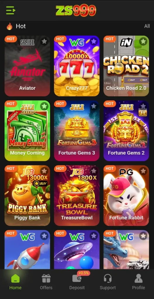 ZS999 Game provides multiple options like slot games, Teen Patti, poker, Fortune Gems, Jilli Slots, Pg Slots, Chicken Road, Chicken Dash, Money Coming and other casino-style games. Players can choose according to their interest and skill level.